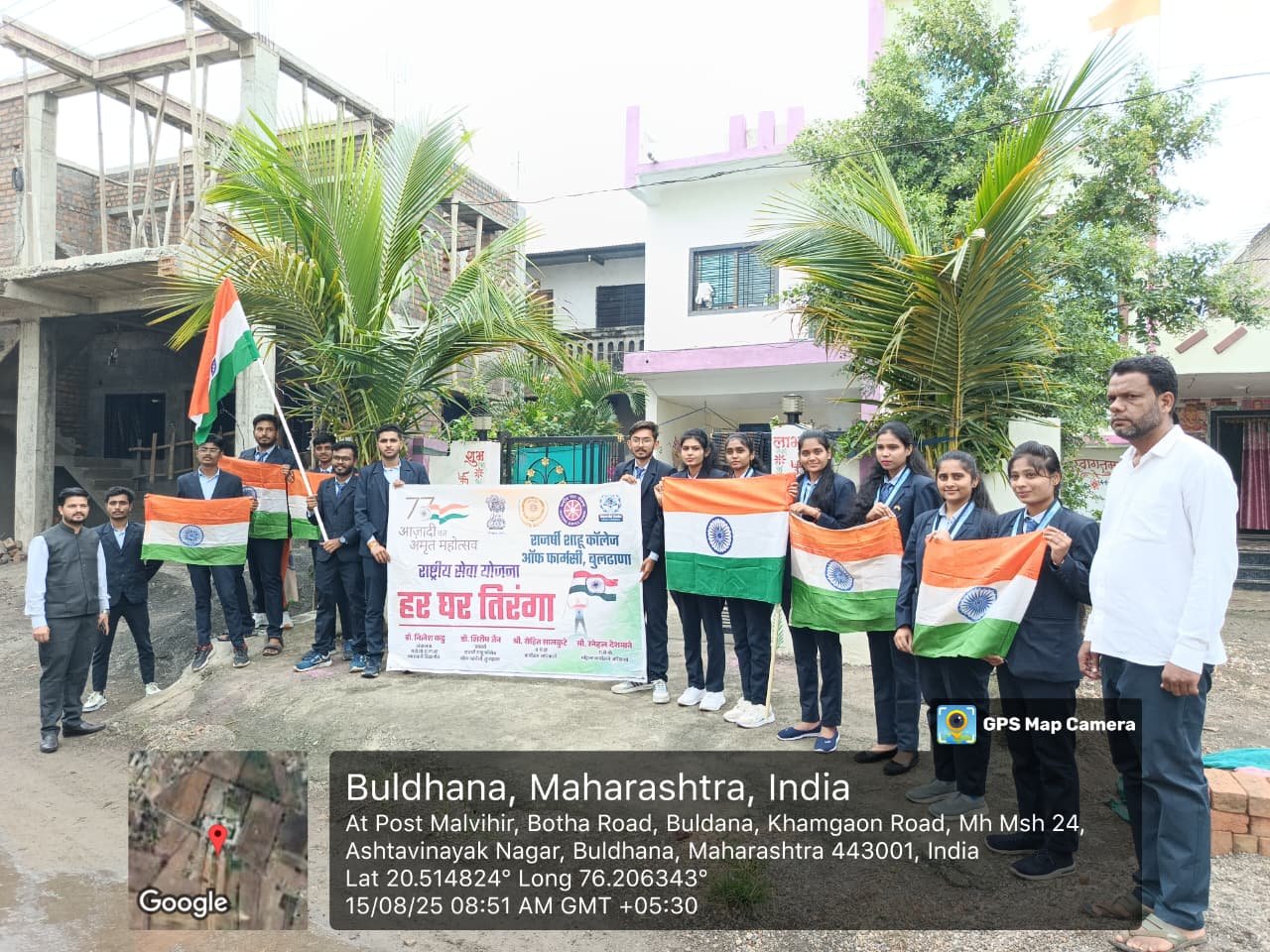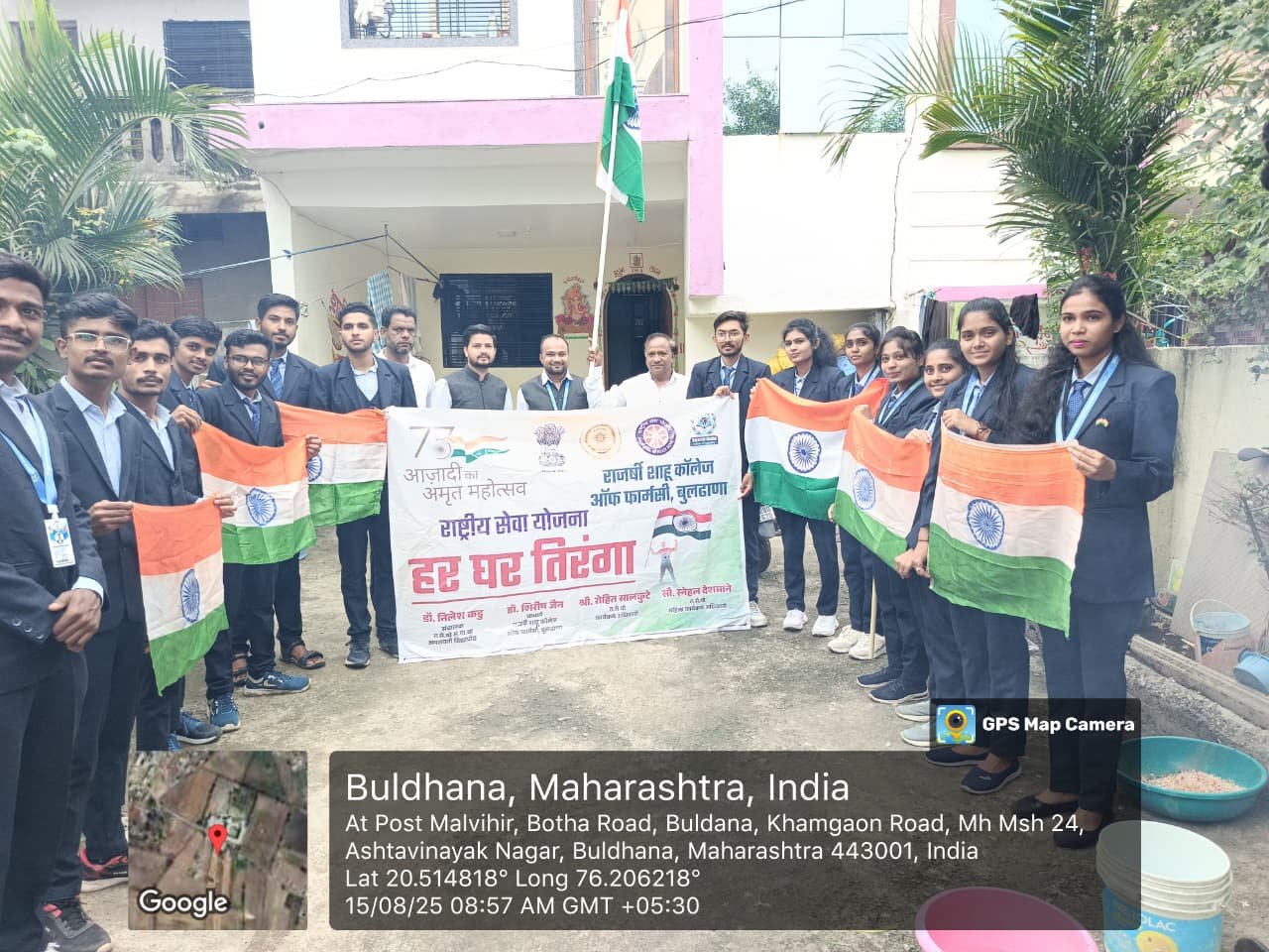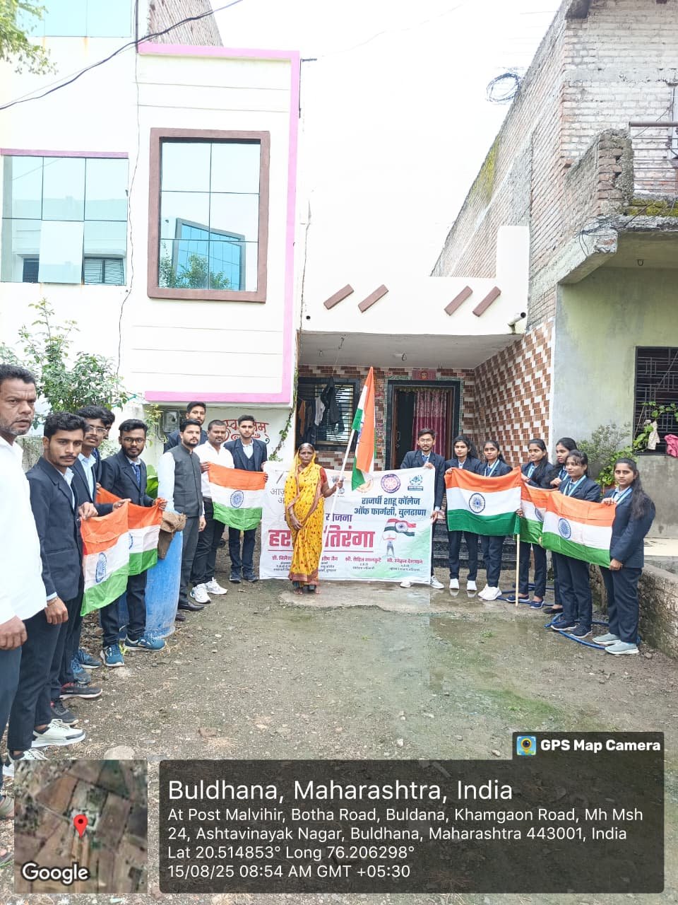 On dated 15th August 2025, 79th Independence Day of our nation was celebrated by Dwarka Bahuudeshiya Gramin Vikas Foundation’s Rajarshi Shahu College of Pharmacy, Buldhana. Chief Guest of this function was Sau. Padmatai Sawale. At morning sharp at 07:45 A.M., flag hoisting was conducted with the hands of Sau. Padmatai Sawle, Secretary DBGVF, Buldhana. All the Faculty, Office Staff Members, Supporting staff members and students of M. Pharm, B. Pharm and D. Pharm are present for this programe. On this occasion we remember the greatest contribution of our Shahid Freedom Fighters, and as an Indian we fill proud on them. On this greatest occasion Sau. Padmatai Sawale given their wishes to all the staff and students. Dr. Shirish Jain Sir (Principal Rajarshi Shahu College of Pharmacy-Buldhana) expressed their views about the proud Indian cultural, achievements and greatest contribution of India in world economy and progressive sectors. Organization and anchoring responsibilities of this function was successfully conducted by Mr Rohit P Salkute (NSS Program officer ) & Mr. Yogesh Joshi (Administrative Officer, Rajarshi Shahu College of Pharmacy-Buldhana).