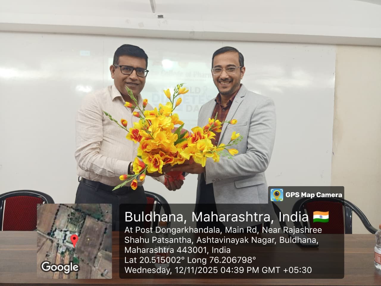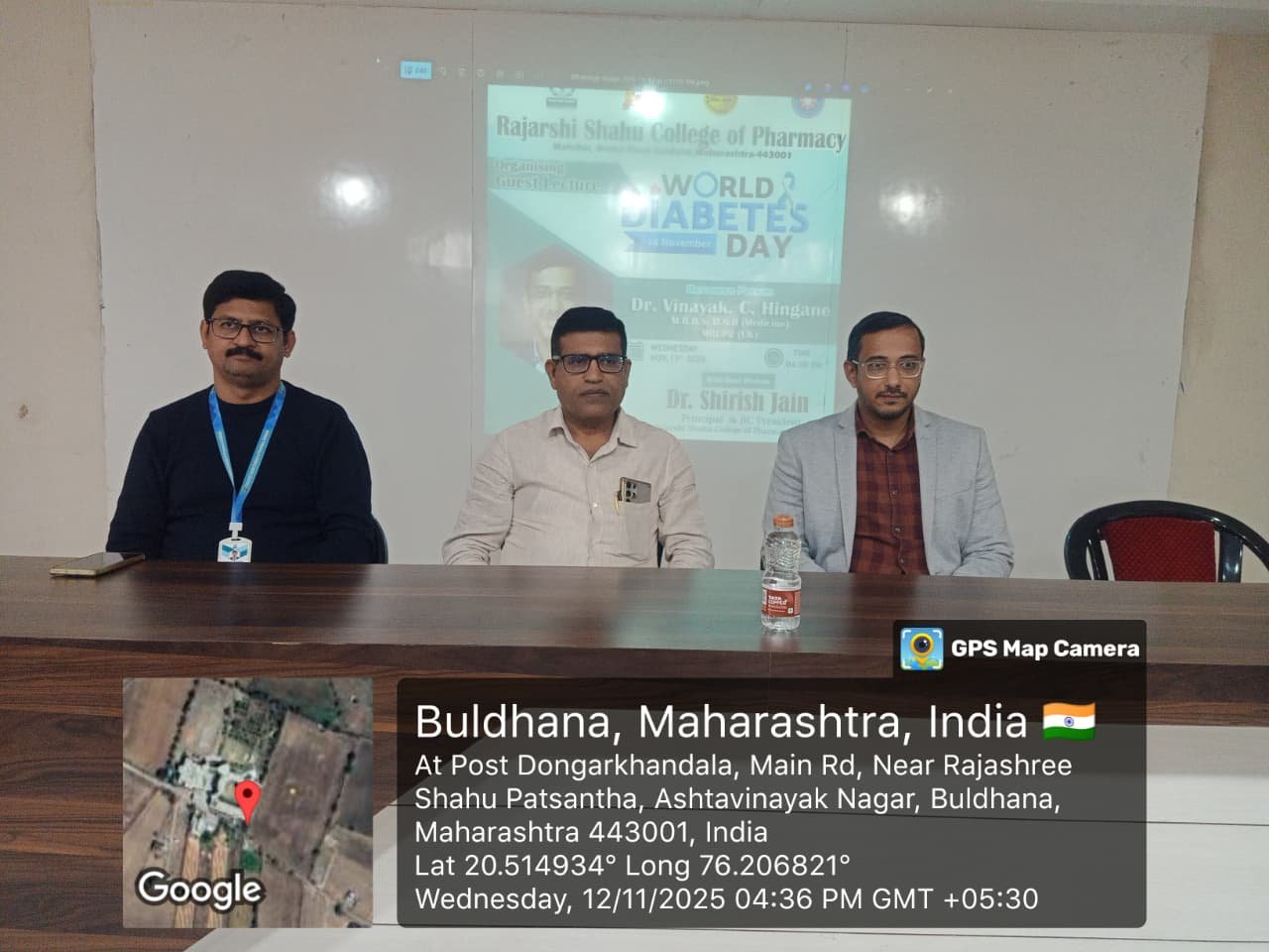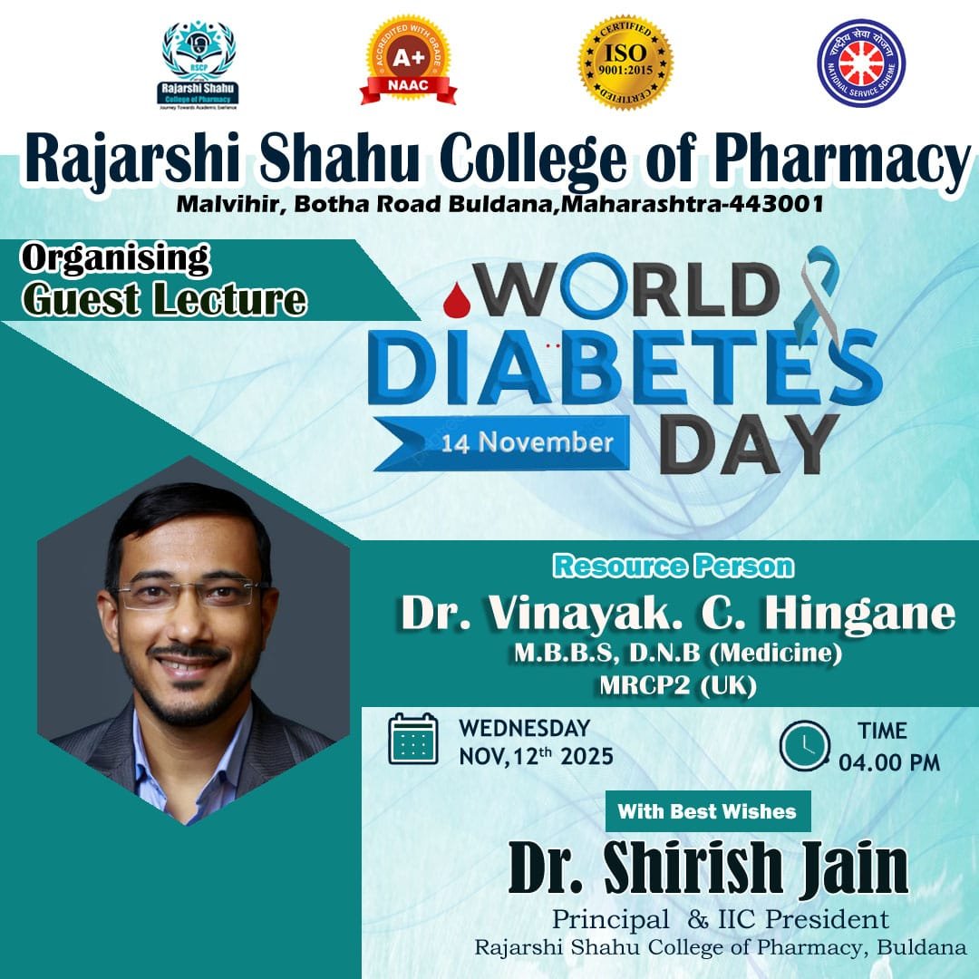On the occasion of World Diabetes Day, a Guest Lecture was organized by Rajarshi Shahu College of Pharmacy, Buldana on 12th November 2025. The session aimed to raise awareness about diabetes, its prevention, and effective management strategies through lifestyle modification and medical care. The resource person for the lecture was Dr. Vinayak C. Hingane (M.B.B.S., D.N.B. Medicine, MRCP2 UK), Consultant Physician at Amrut Hrudayalay, Buldana, who delivered an insightful and interactive session. Dr. Hingane emphasized the role of balanced nutrition, regular exercise, stress management, and patient education in maintaining healthy blood glucose levels. The lecture was highly informative and engaging, providing valuable knowledge to students and faculty members.