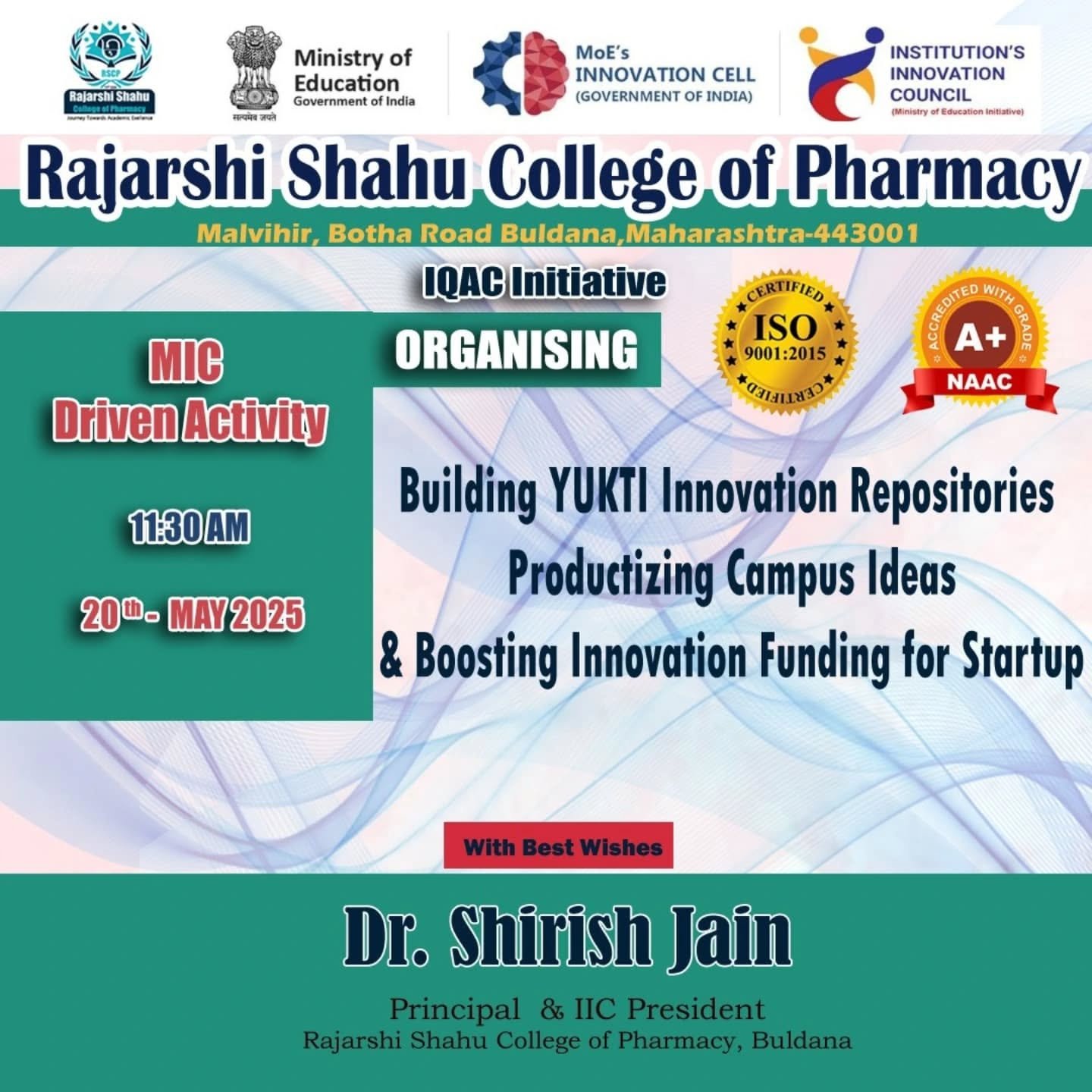 Rajarshi Shahu College of Pharmacy, Buldhana has organized an online session titled “Building YUKTI Innovation Repositories: Productizing Campus Ideas & Boosting Innovation Funding” on 20th May as part of the MIC Driven Activity (Q3–IIC 7.0). The session aimed to guide IIC institutions in establishing YUKTI Innovation Repositories to streamline campus innovation support systems and enhance funding opportunities for innovative ideas and startups. It also provided comprehensive insights into the guidelines and participation criteria for two key initiatives—YUKTI Innovation Challenge 2025 and the AICTE Productisation Fellowship.