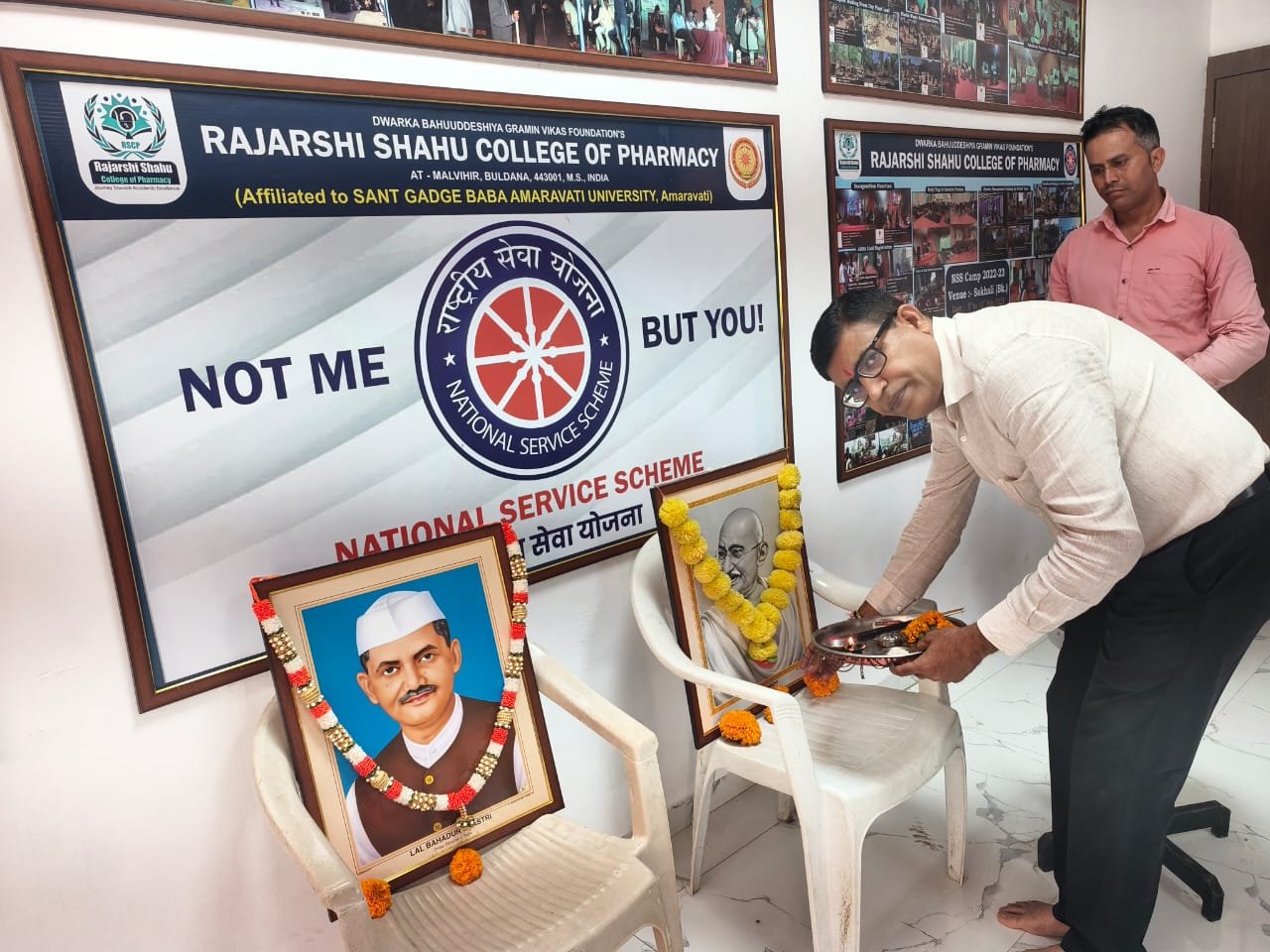 We have successfully celebrated Mahatma Gandhi and Lal Bahadur Shastri Jayanti at Rajarshi Shahu College of Pharmacy, Buldhana, with great respect and enthusiasm. The program was aimed at remembering the invaluable contributions of both leaders in India’s freedom struggle and governance. Students and faculty members gathered to pay tribute and reflect on their teachings. The event highlighted their messages of truth, non-violence, simplicity, and dedication to the nation.